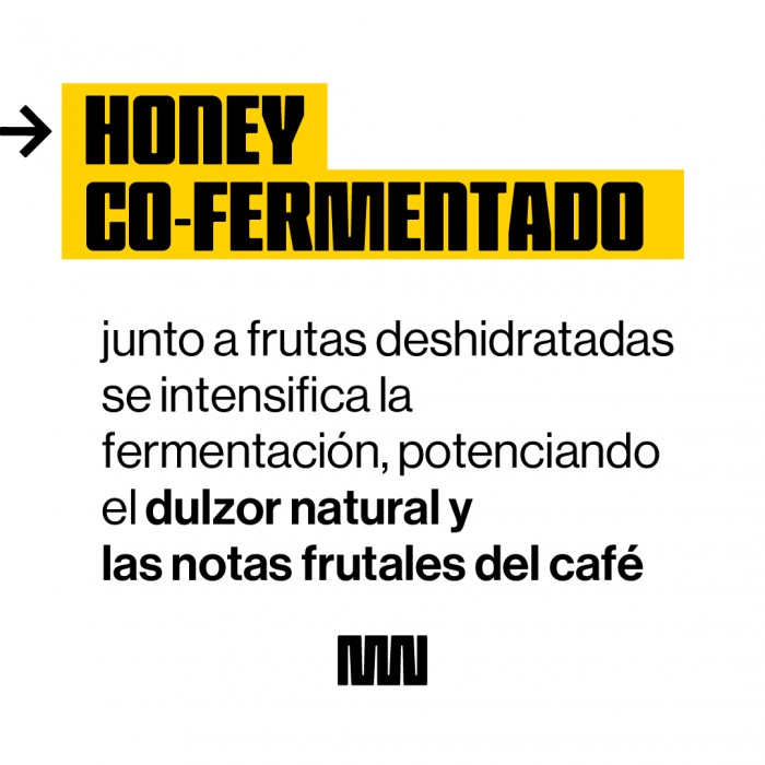 La combinación del proceso Honey con frutas deshidratadas osmóticamente crea unambiente muy rico en azúcares y aromas, lo que impulsa una fermentación más intensa y llena de sabores. Este método potencia las notas frutales y el dulzor natural del café, logrando una taza más expresiva y compleja.